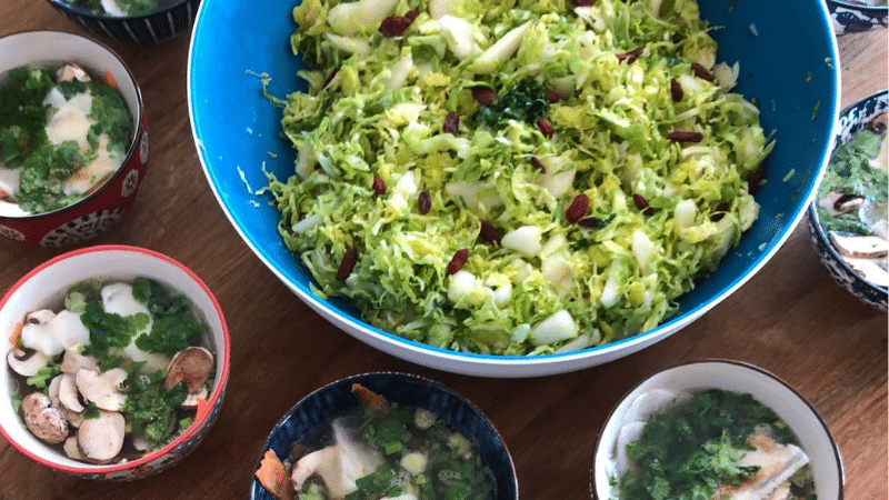 Dans des petits bols, répartissez : quelques tranches de carottes et navets à l’économe, de champignon, 1 càc d’oignon nouveau émincé, de coriandre hachée, de jus de citron, de tamari, de miso blanc. Rajouter de l’eau chaude au moment de servir.